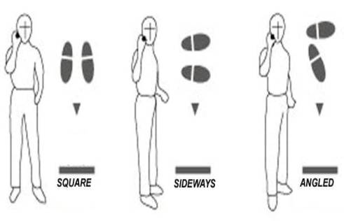 First of all find a comfortable, well balanced stance - not leaning over too far. The orientation of the feet to the oche is not important as long as you are